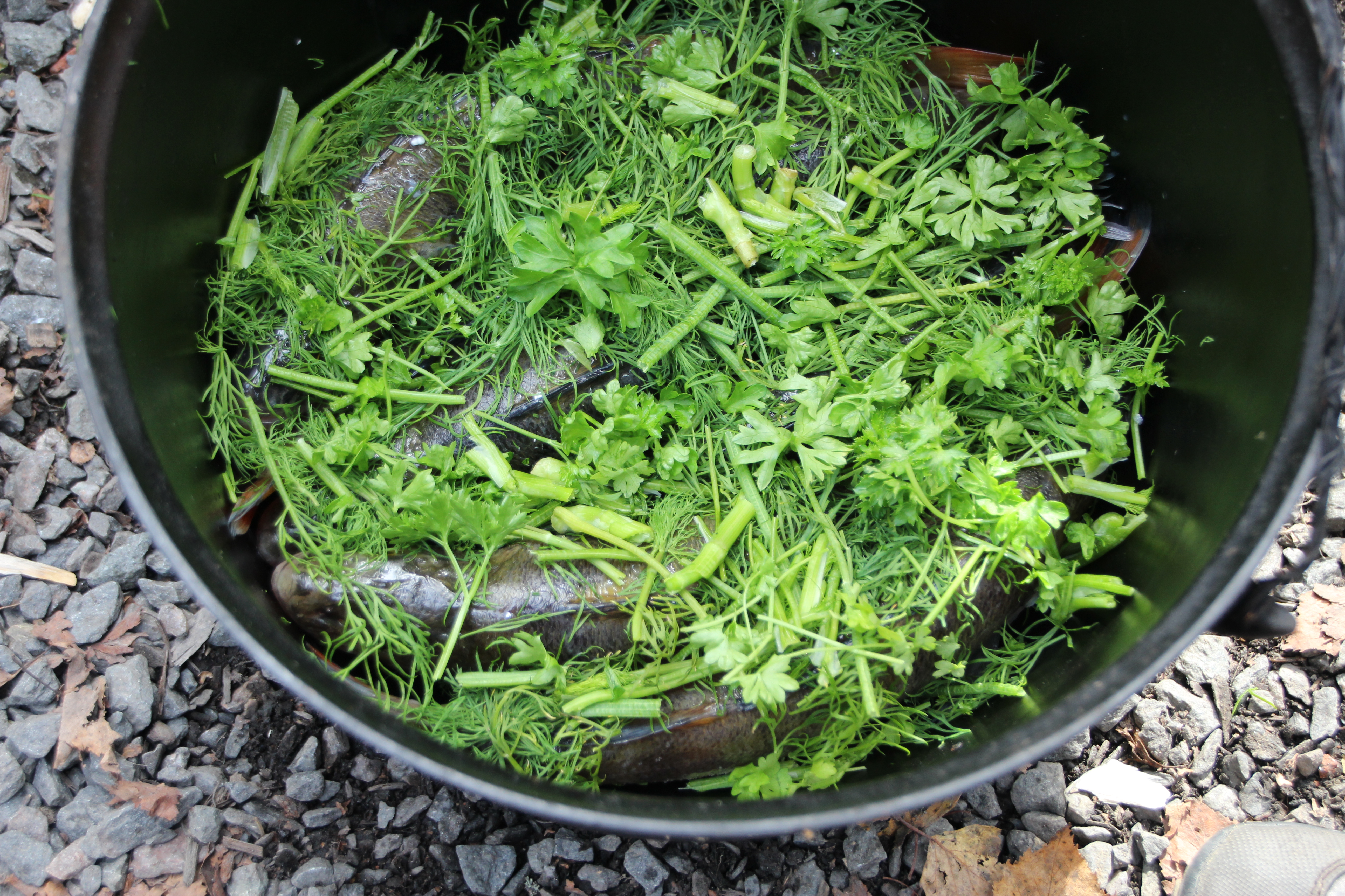 Cover the bottom of the pot with a layer of fresh dill and parsely.