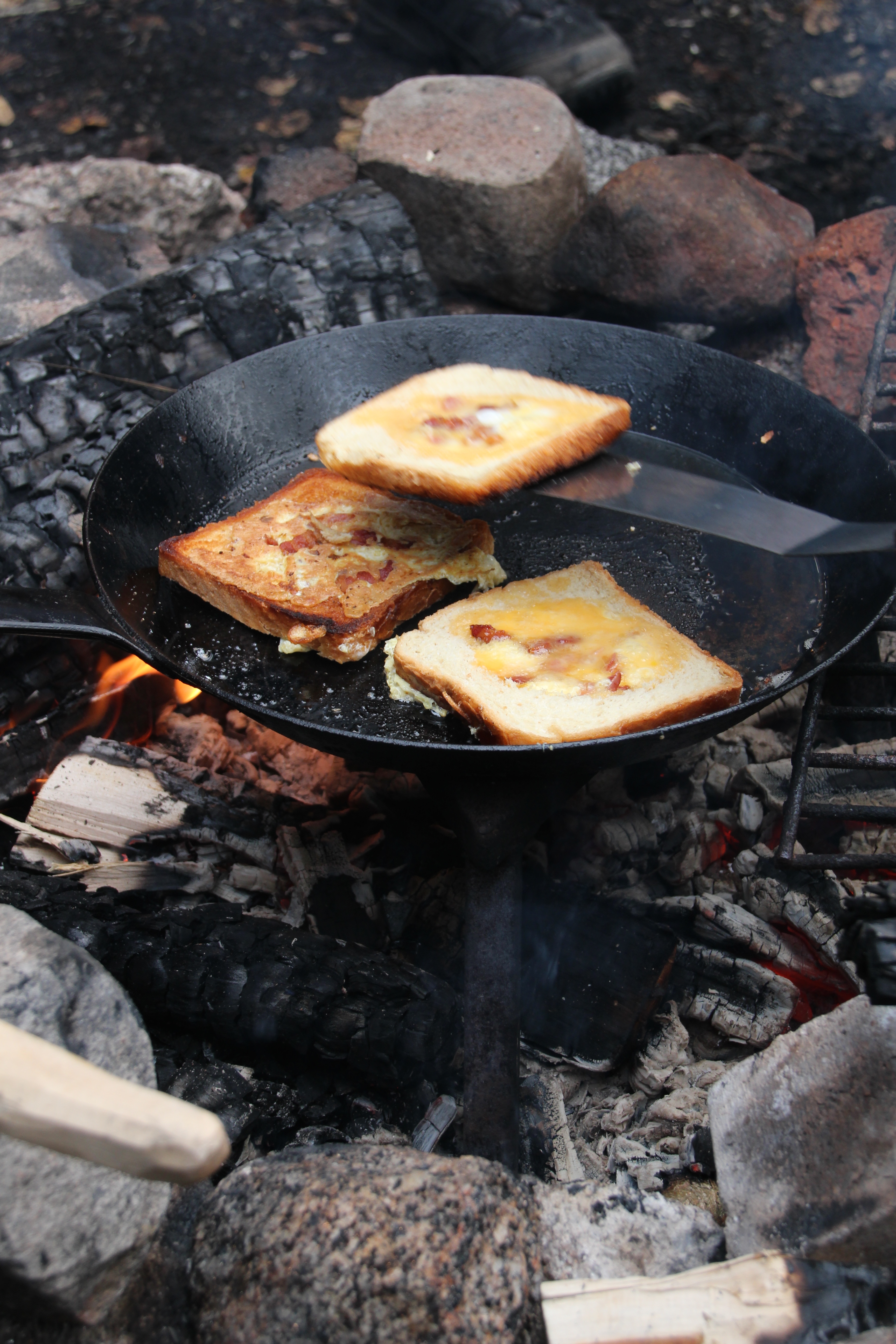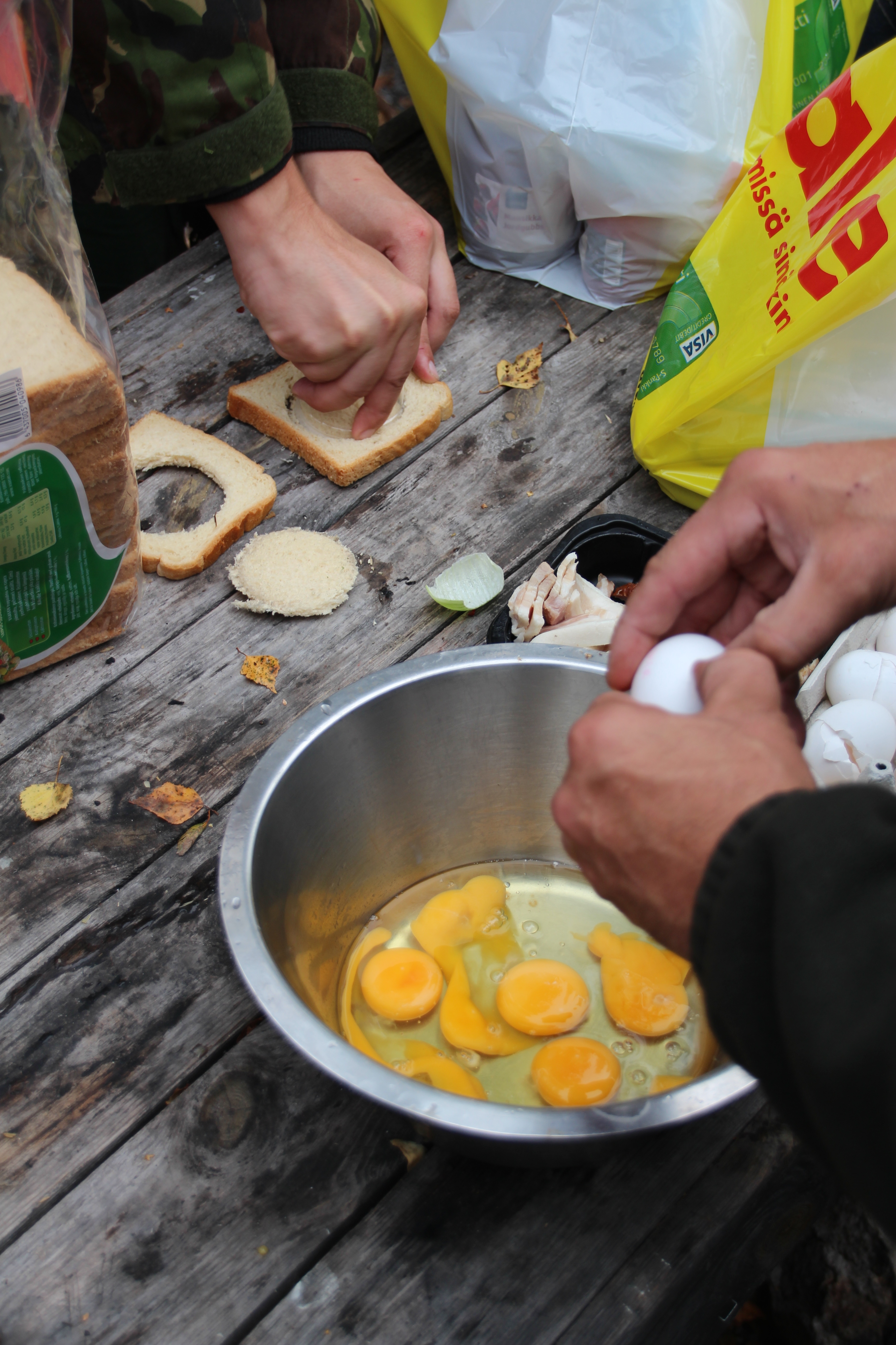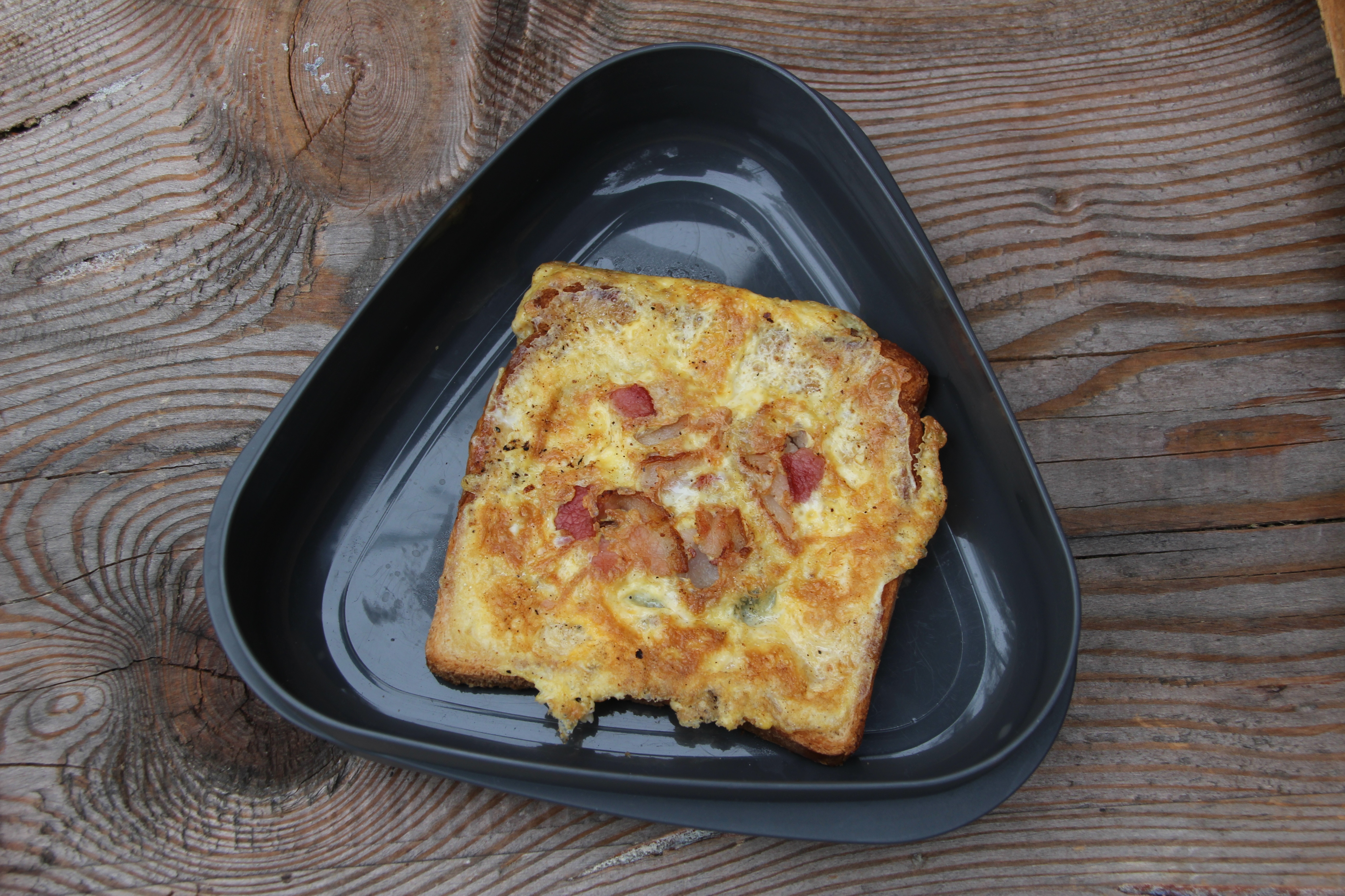 Mettre les tranches de pain grillé dans la poêle et déposer un peu de bacon frit au centre de chaque tranche. Recouvrir le bacon d’oeufs battus à l’aide de la louche. Rajouter un peu d’huile d’olive dans la poêle entre chaque fournée.