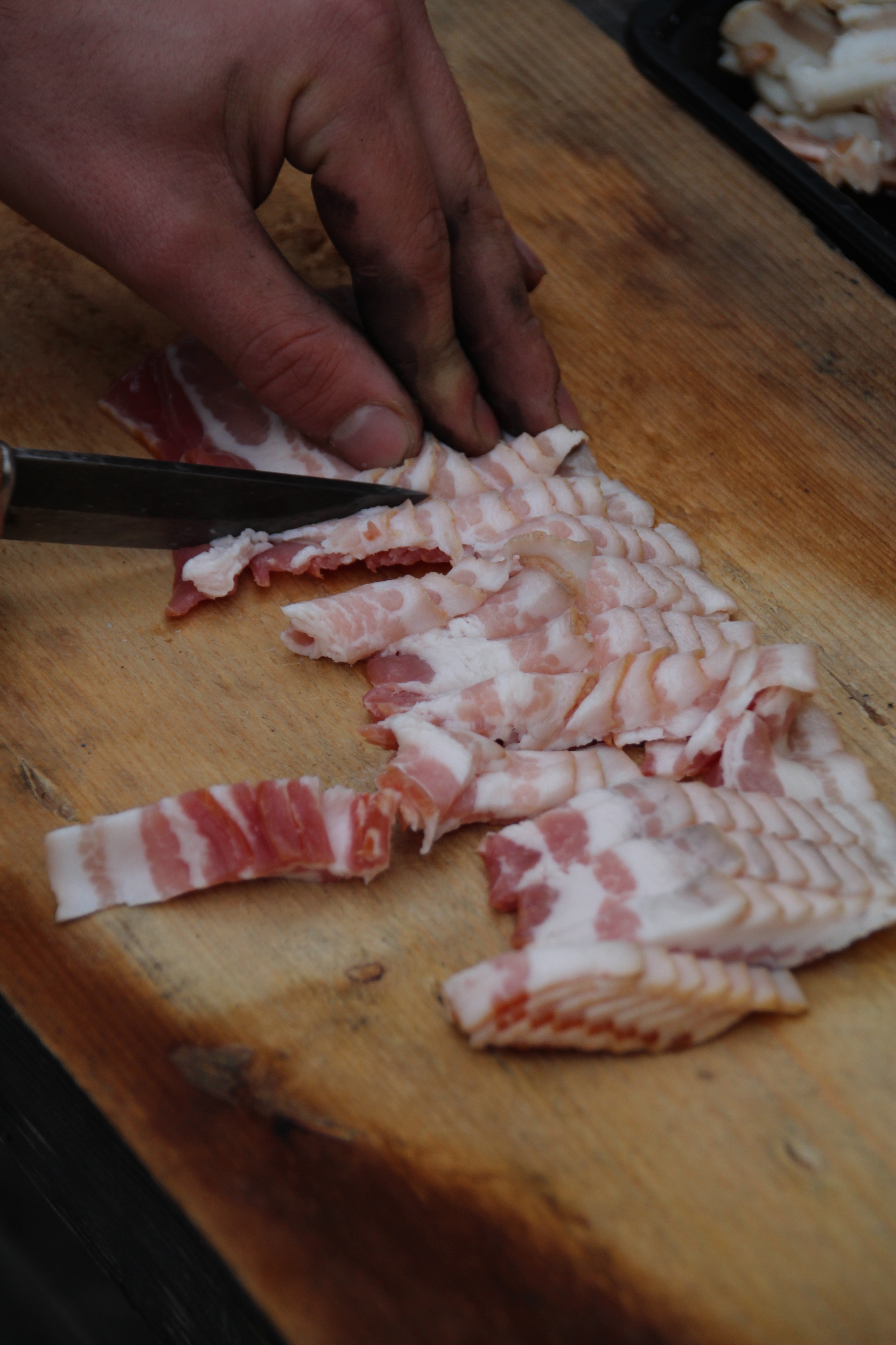 Put the toast (with a hole in the middle) into the pan and add some of the fried bacon. Add some egg using a ladle. From time to time it will be necessary to add some olive oil to the pan.