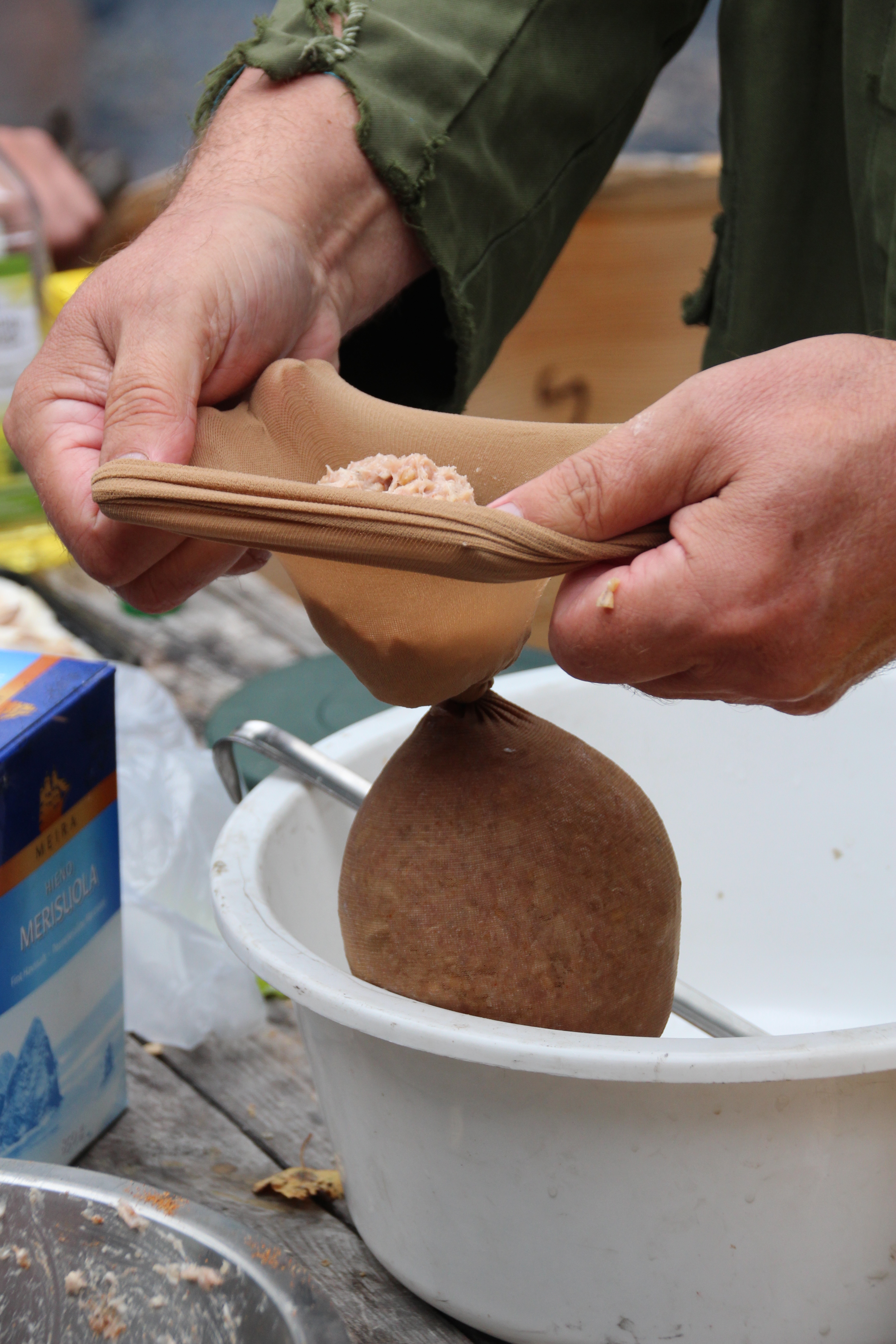Farcir le mi-bas avec le mélange obtenu. Nouer-le à intervalle régulier afin de former un chapelet de saucisses. Placer dans un sac de cuisson et le fermer hermétiquement.