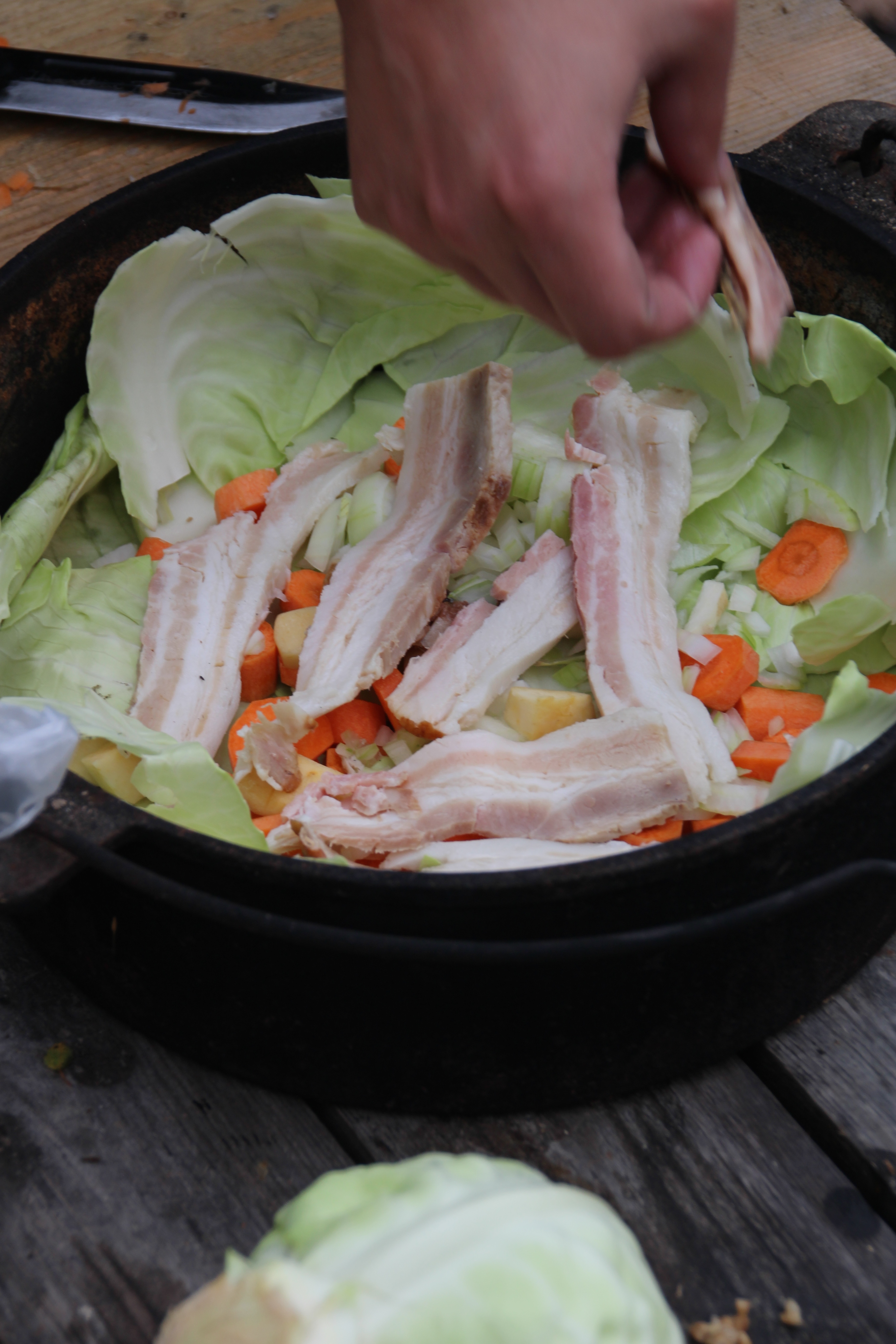 Add the meat to the Dutch oven, followed by another layer of chopped veggies (see above). Cover everything with cabbage.