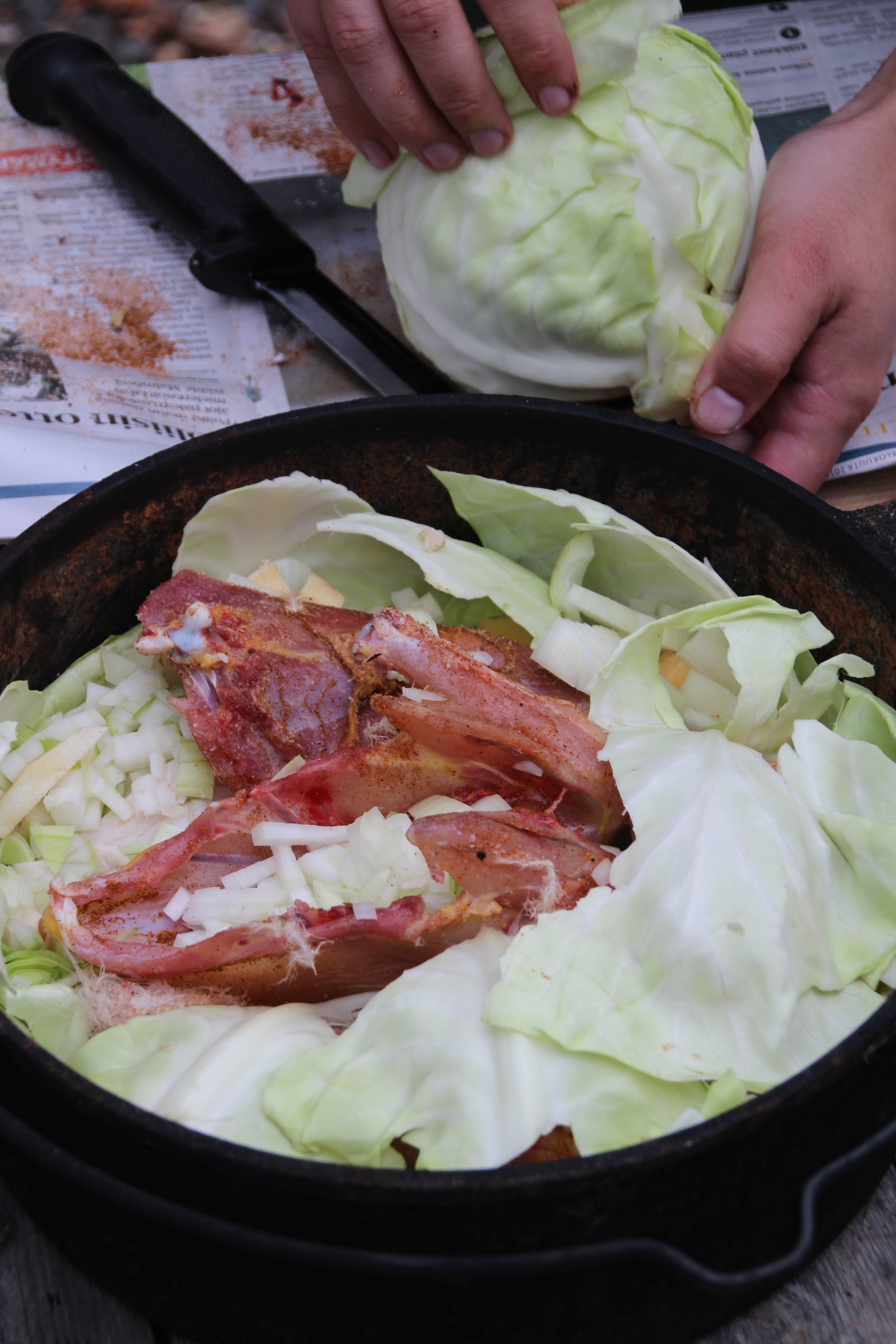 Then cover the whole oven with cabbage leaves. Add chopped onions, yellow turnip, carrots, and the remaining pork slices. Spice the rooster meat with jauhelihamauste and salt.