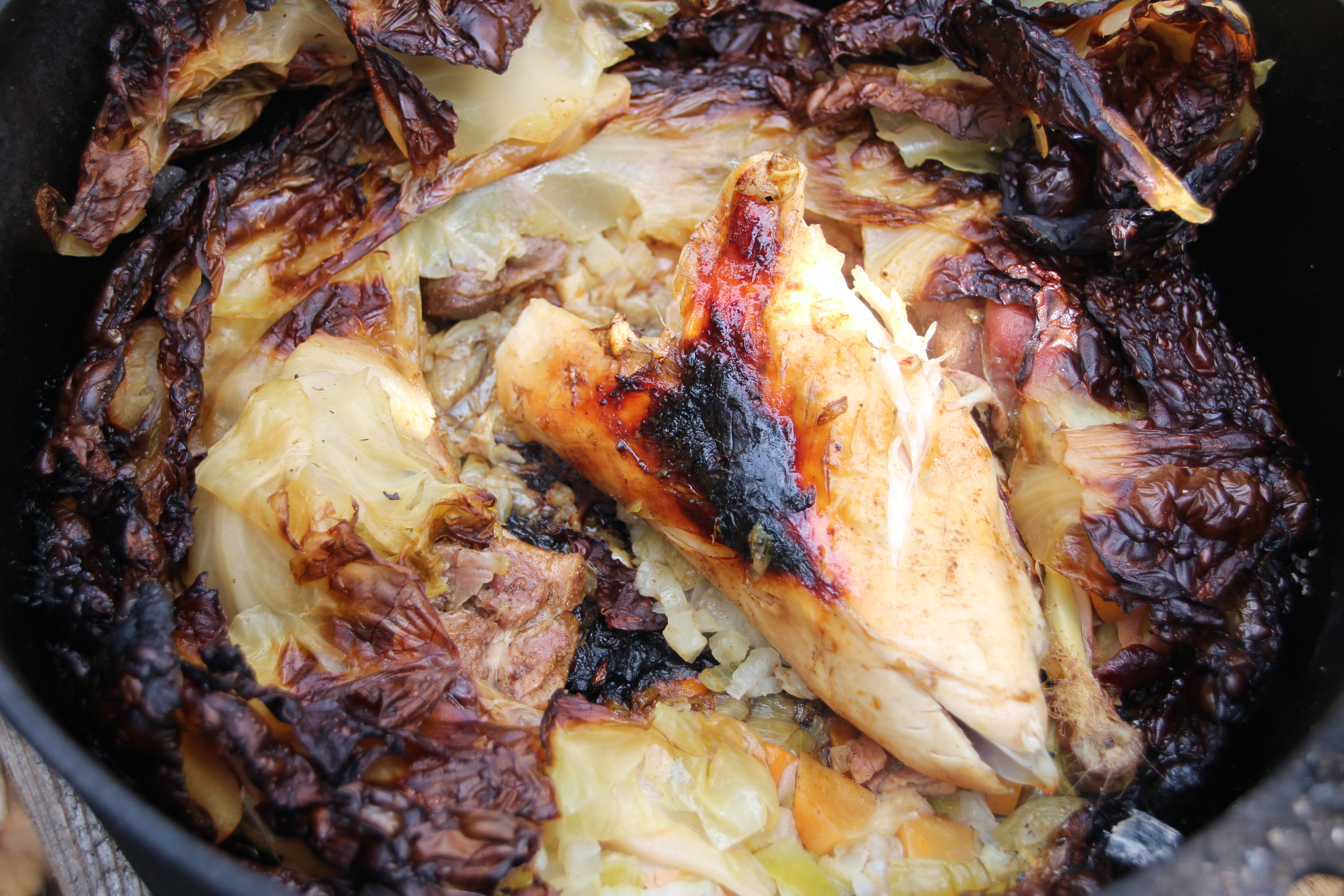 Put the Dutch oven to the fire and cover it with hot coal.