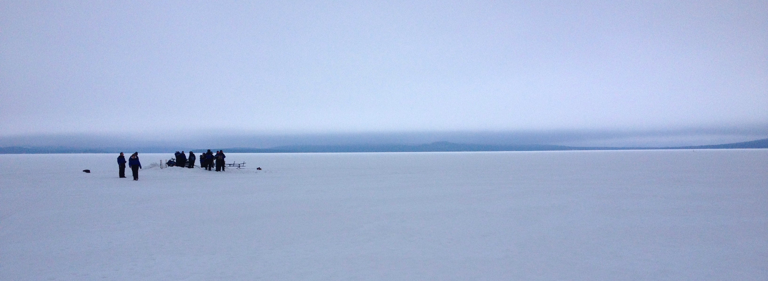 Le classique safari pour la pêche blanche. Tout d’abord un petit tour sur le lac pour vérifier les filets (vides) et permettre aux clients une première prise en main des scooters des neiges. Le temps n’est pas très clément mais le jour blanc transforme tout en paysage lunaire. Aucune différence entre le lac recouvert de neige et le ciel blanc. Après avoir percé des trous dans la glace épaisse d’un mètre, les clients font preuve de plus ou moins de motivation dans leur volonté de ramener des poissons. Le résultat est à la hauteur de leur envie, aucun poisson ne viendra se suicider sur les mini-cannes à pêche.