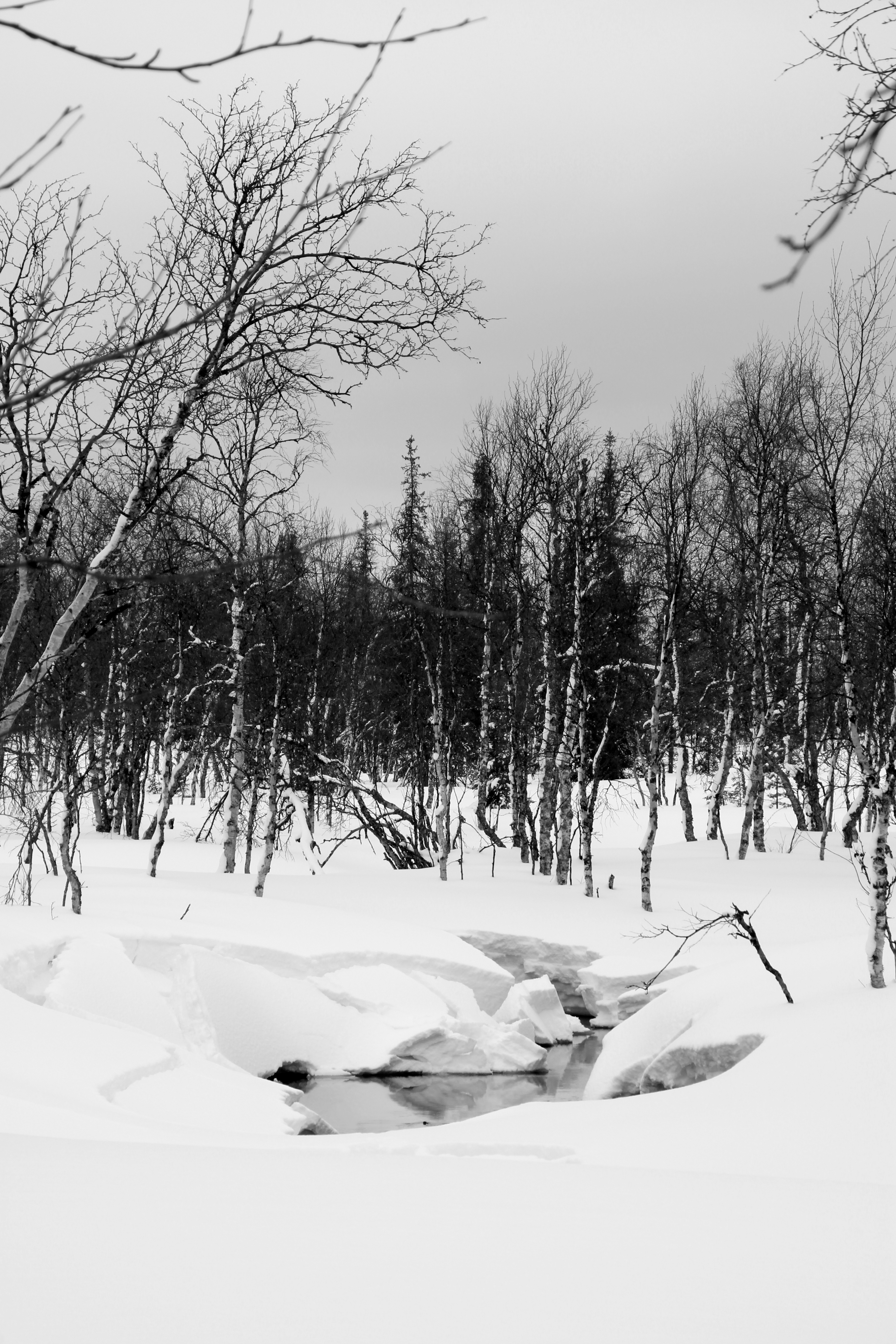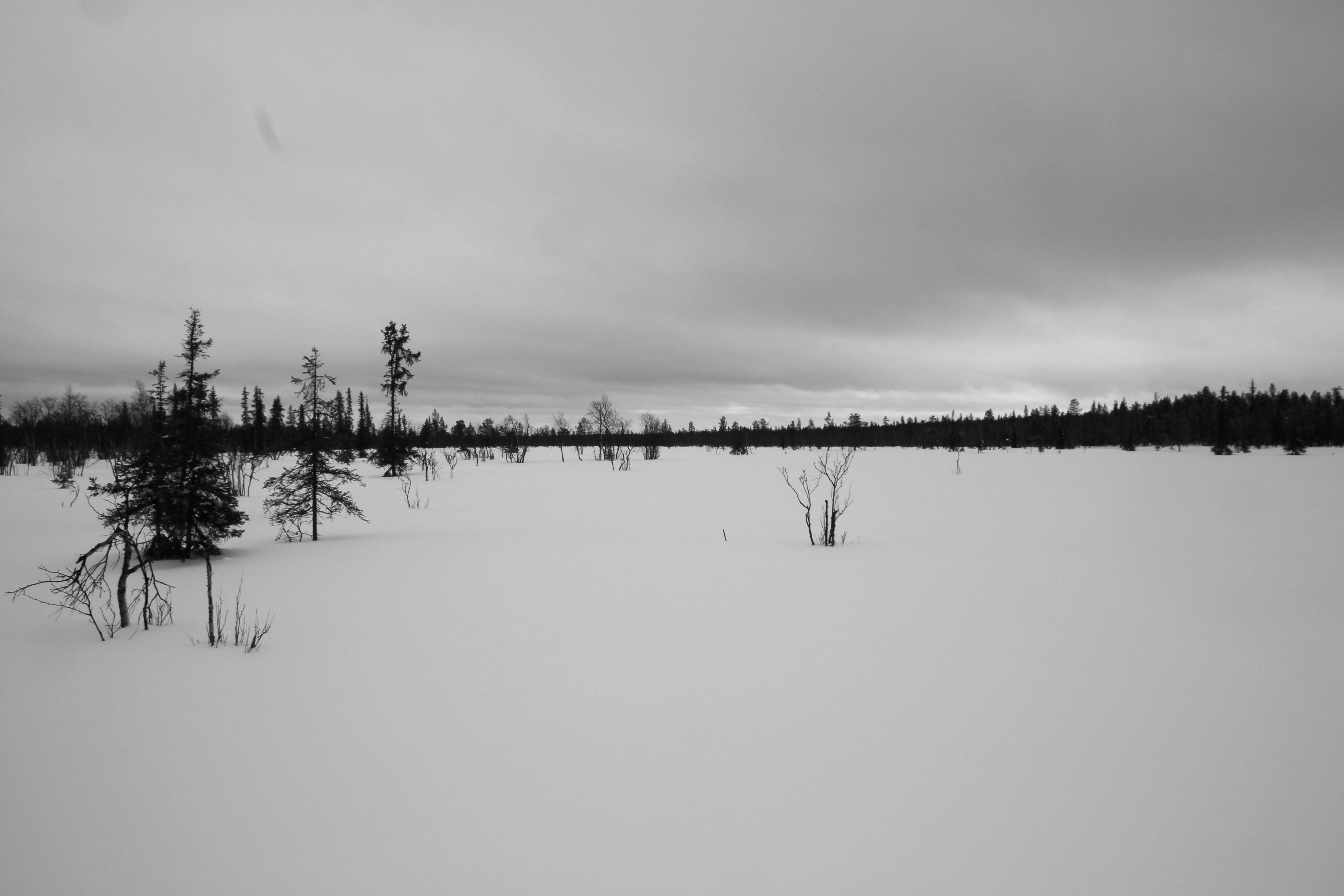 Around a maze of frozen marshes that snake their way between hills covered with pine, spruce and birch rare, Thibault knows he can lose them easily. His only chance is to climb the hill overlooking the landscape. If winter launches a final attack against the spring, his hopes will be shattered. The climb is exhausting. The night was too short and his body is very painful. Despite his snowshoes, he sometimes knee deep in snow. Every step is a small victory. Soon vegetation changes and trees became more frail and less numerous. Snow weighs down tree limbs and draws disturbing and spooky shapes.