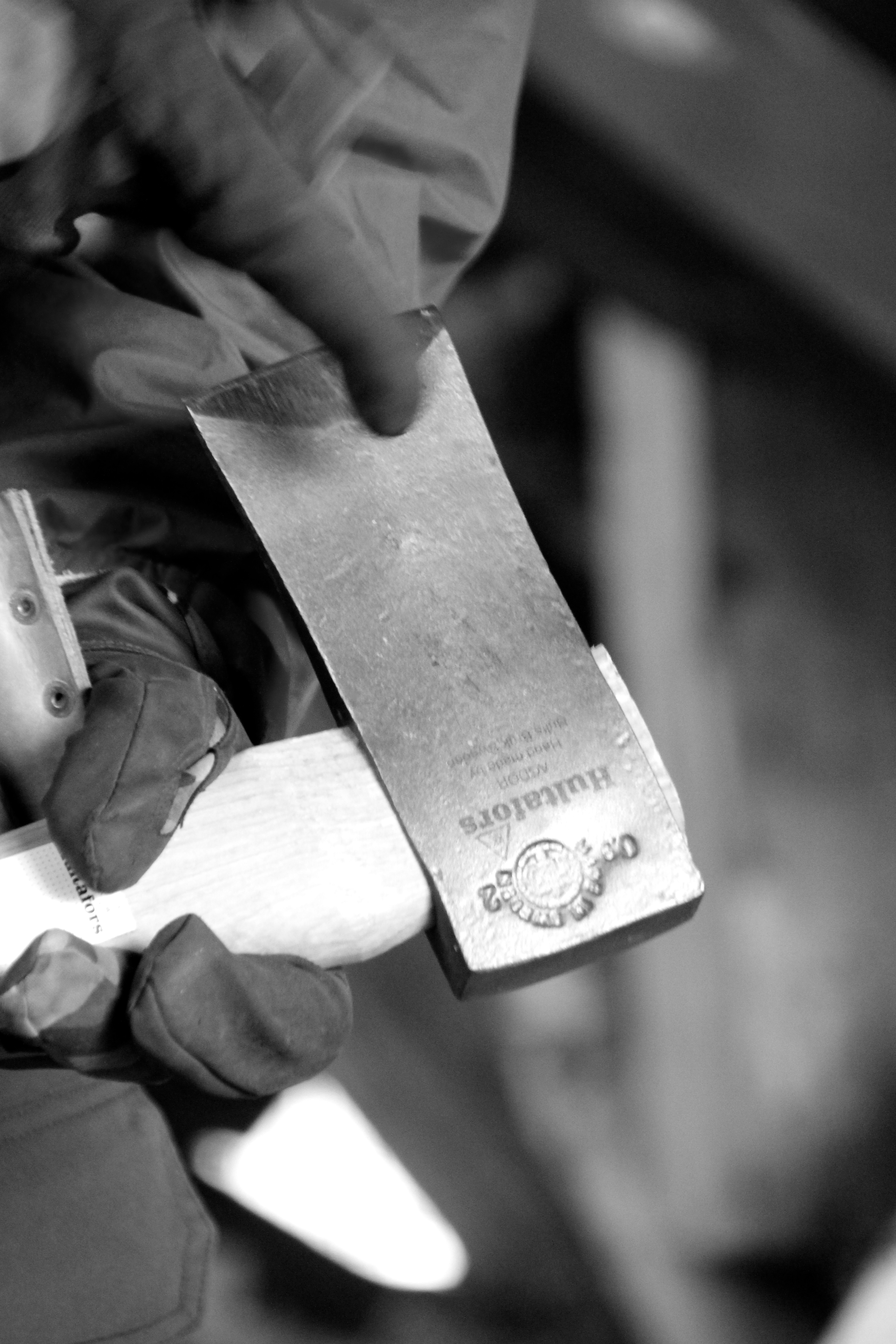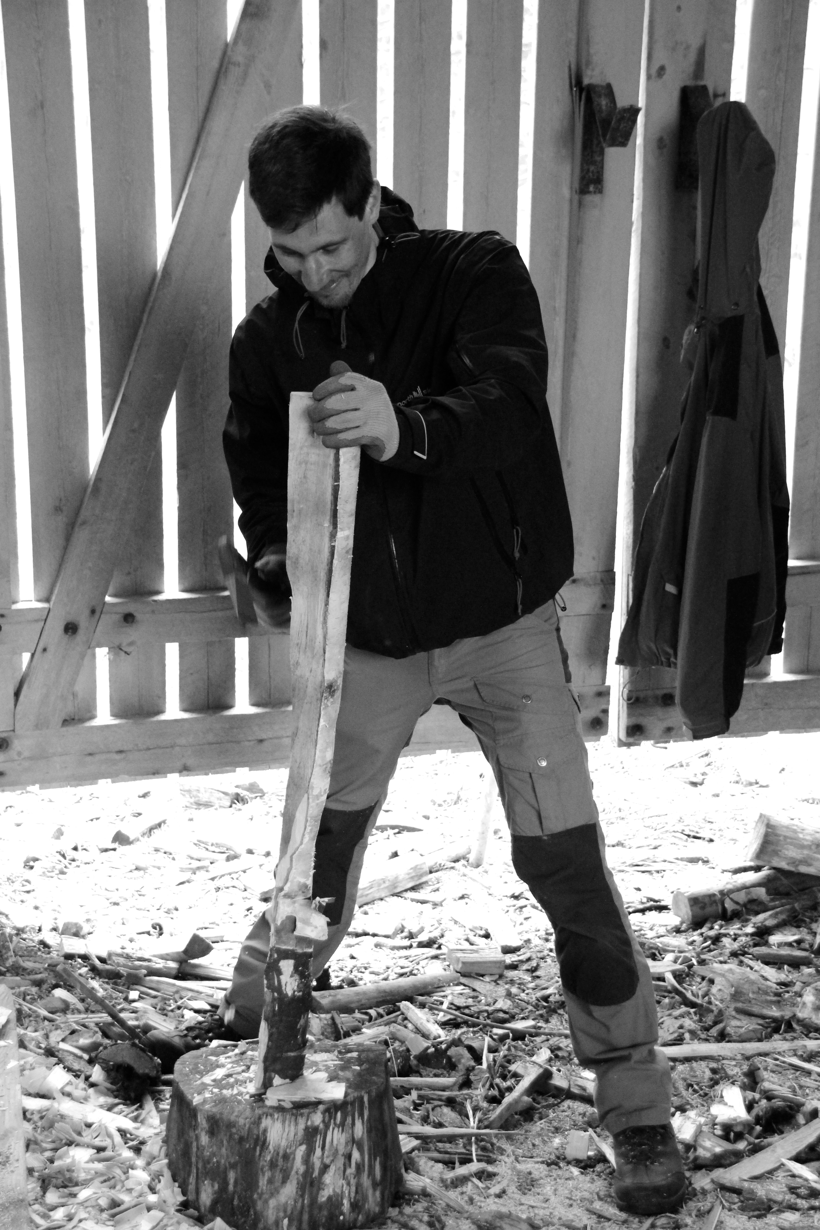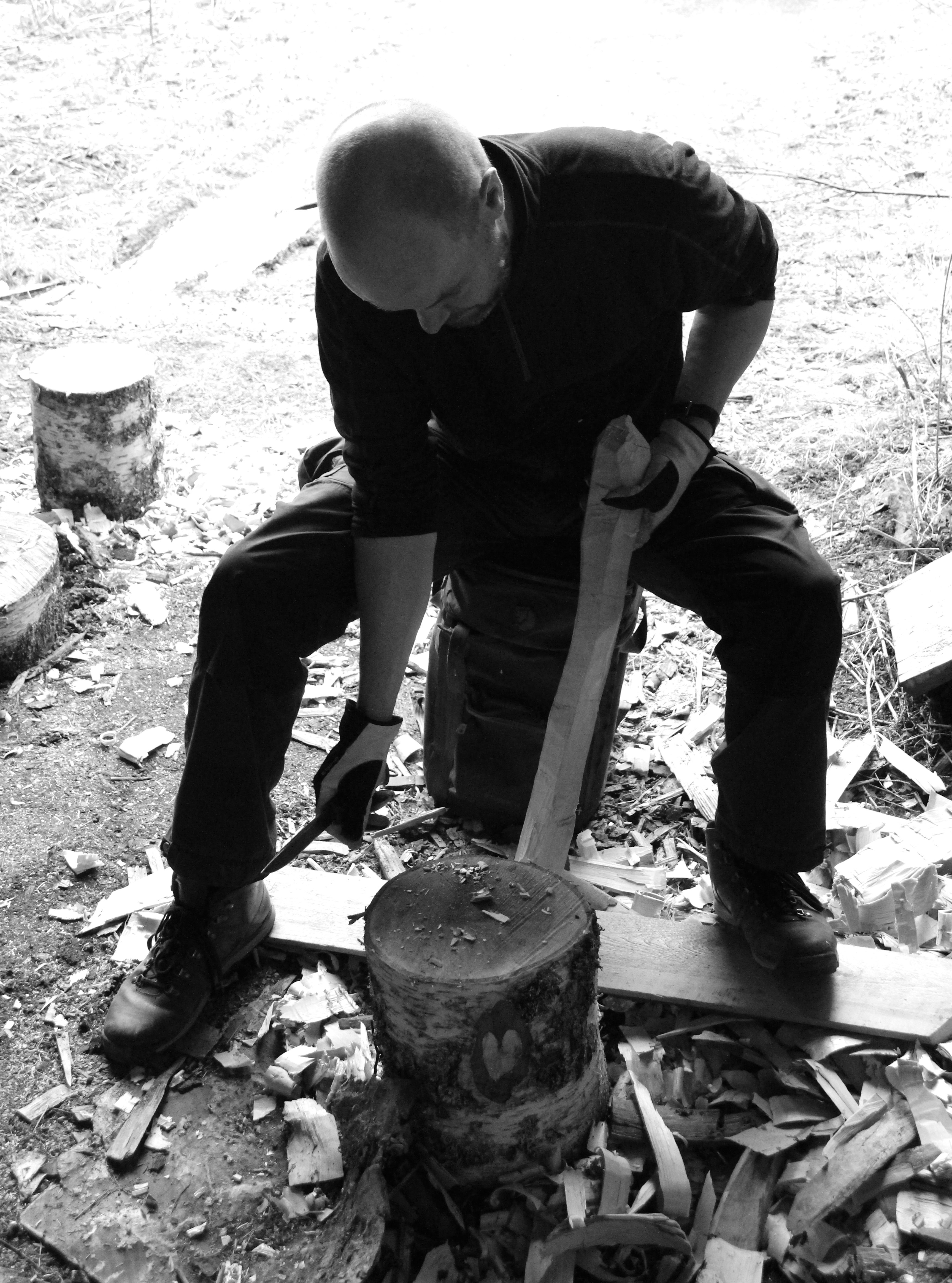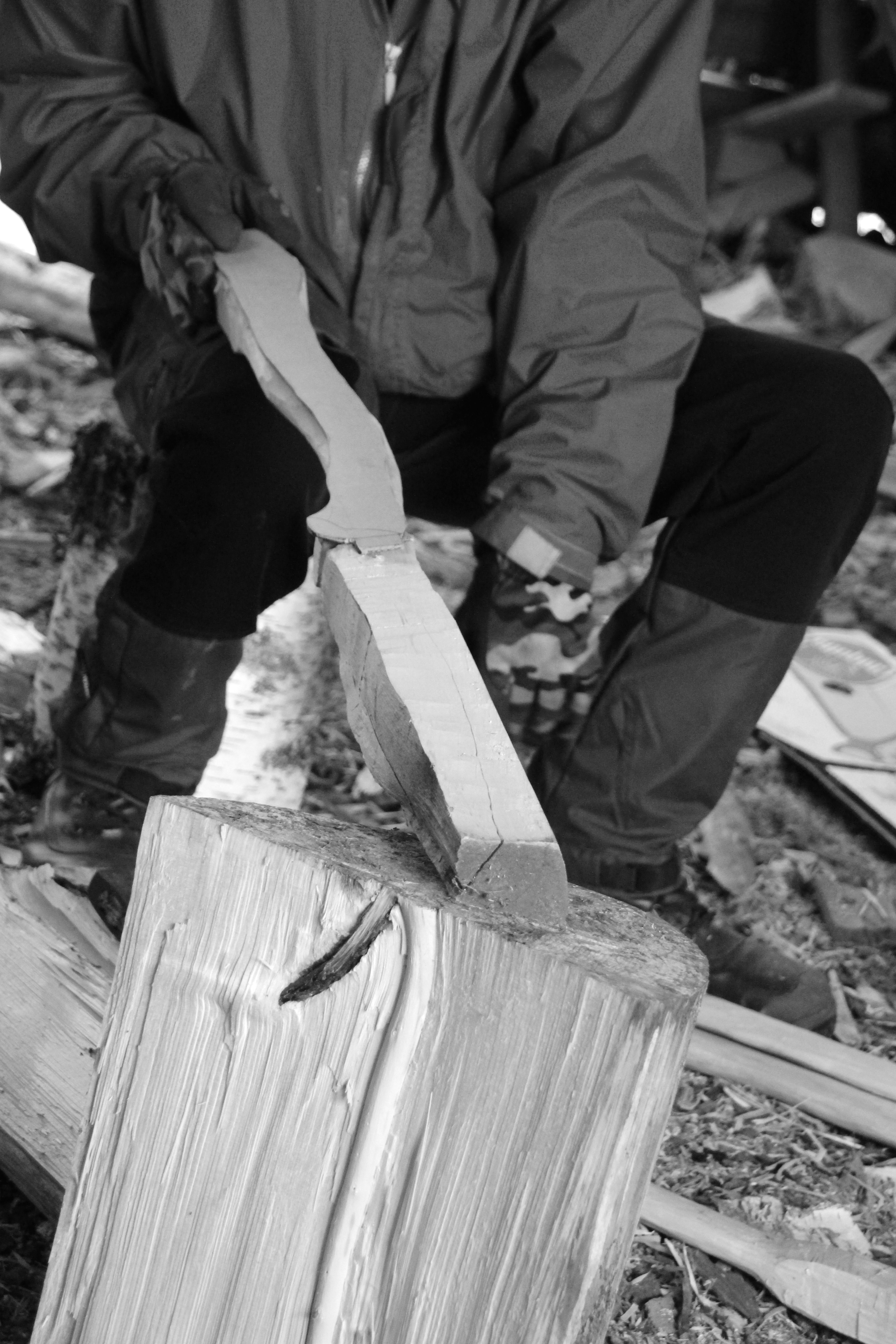 Sous la houlette de Miko, nous apprenons à remplacer un manche de hache. Après un rappel sur l’entretien de cet élément essentiel de notre équipement, nous sélectionnons un morceau de bois de bouleau (le frêne est aussi très utilisé). A l’aide d’un patron, nous dessinons ce qui sera notre manche. Ne reste plus qu’à tailler encore et encore. Patience, précision et un peu d’habileté permettent à certains d’avoir un résultat final qui se rapproche des standards voulus.