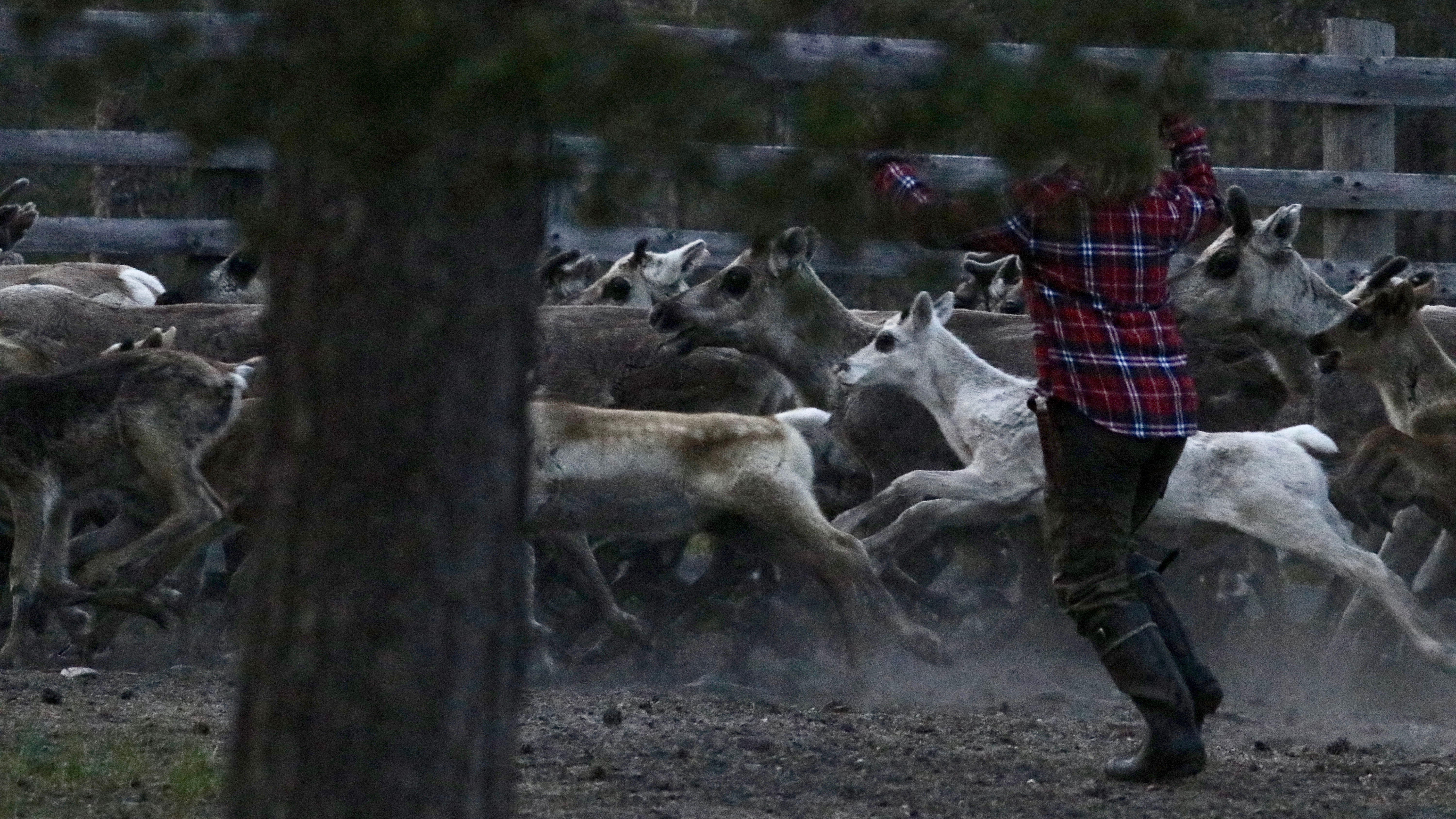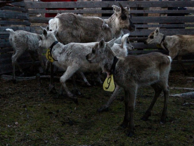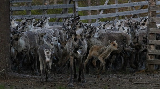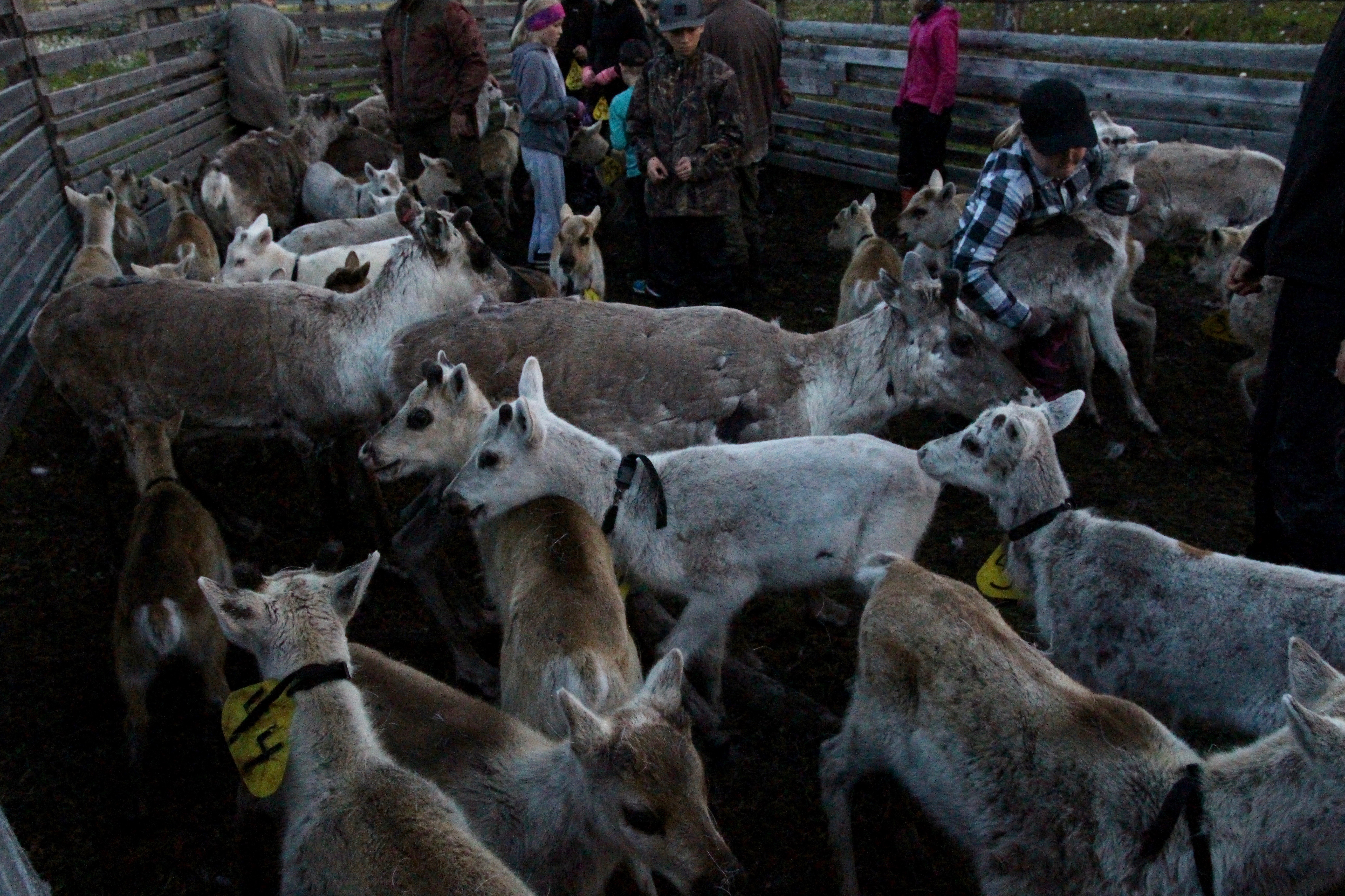Après avoir été rassemblés au moyen d’une battue dans un grand enclos, une partie de la harde est poussée dans des enclos de sélection. Le plus impressionnant peut-être, c’est le râle collectif du troupeau qui monte au fûr et à mesure de l’excitation et du stress des rennes. Les plus jeunes imitent les adultes malgré des cordes vocales pas encore bien matures.