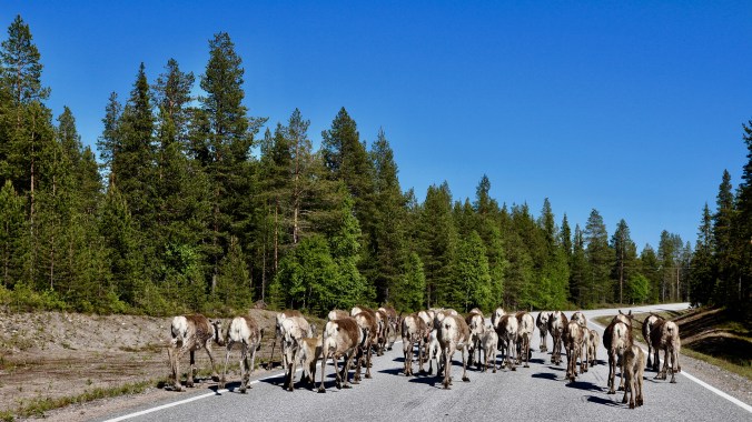 Le matin, les hommes commencent à rabattre les rennes des environs après avoir tracé un entonnoir avec du ruban signalétique. Les côtés du triangle peuvent faire jusqu’à 2 kilomètres. Afin de mieux repérer les groupes de rennes isolés, on utilise parfois un drone. Une bonne cinquantaine de rennes ont été débusqués de la sorte cette fois là.